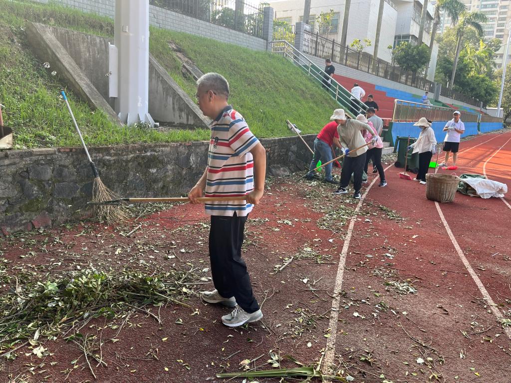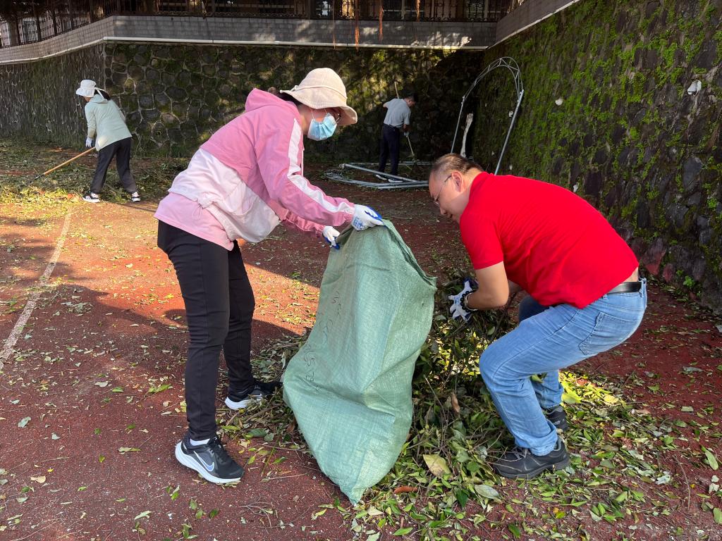 其他教职工同样干劲十足,用扫帚仔细清扫散落的树叶,用垃圾袋认真收集杂物,不放过任何一个卫生死角,大家分工明确又配合默契。一位年轻教职工边清扫边说:“看到校园被台风摧残成这样,心里特别不好受。现在能亲手为校园清理,感觉特别有意义,就像在照顾自己的家一样。”