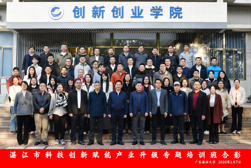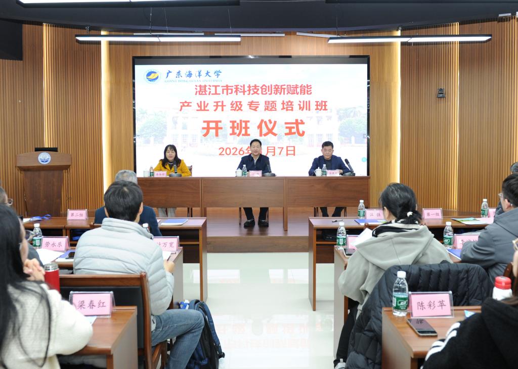 1月7日上午,湛江市科技创新赋能产业升级专题培训班在我校湖光校区正式开班。本次培训旨在深入学习贯彻党的二十大和二十届四中全会精神,聚焦实现高水平科技自立自强,推动科技创新与产业创新深度融合,为湛江培育新质生产力、实现产业高质量升级注入强劲动能。湛江市科学技术局党组书记、局长江强,湛江市科学技术局党组成员、副局长、三级调研员彭国坚,湛江市“百县千镇万村高质量发展工程”指挥部办公室专职副主任陈云,湛江市工业和信息化局党组成员、副局长庞建兴,湛江市科学技术局四级调研员曾新强,广东海洋大学继续教育学院副院长潘康培和来自市县两级科技与产业管理一线、高新区、科研院所及重点企业的61名学员参加开班仪式。