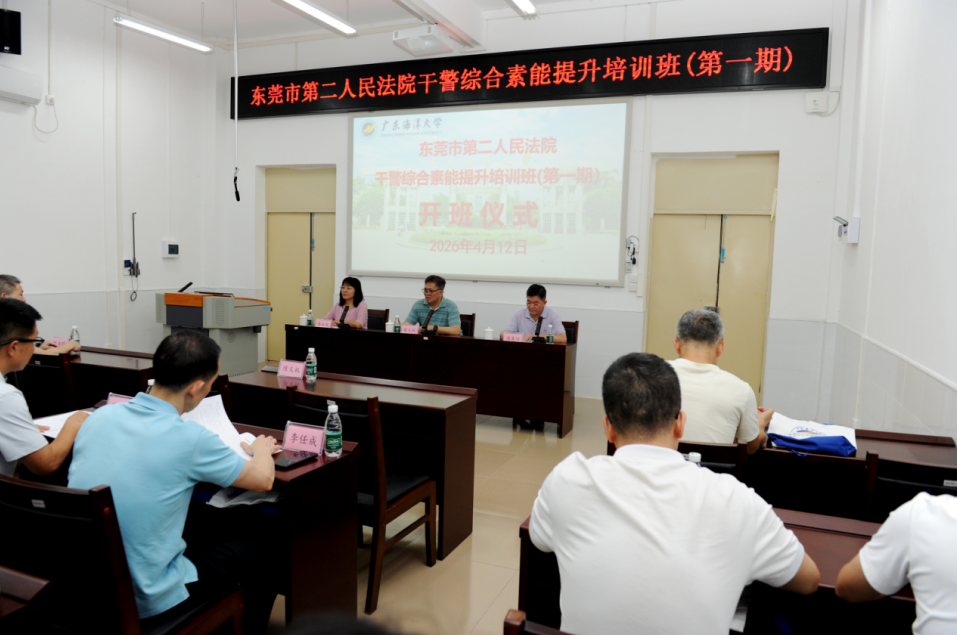 开班仪式上,潘康培代表学校对东莞市第二人民法院各位领导和学员的到来表示热烈欢迎,并介绍了广东海洋大学的发展历程、学科优势及服务社会的能力。他表示,学校高度重视本次培训,精心设计课程、选配优质师资,着力推动理论与实务相结合、通识与专业相融合,助力法院干警提升综合素质和履职能力。